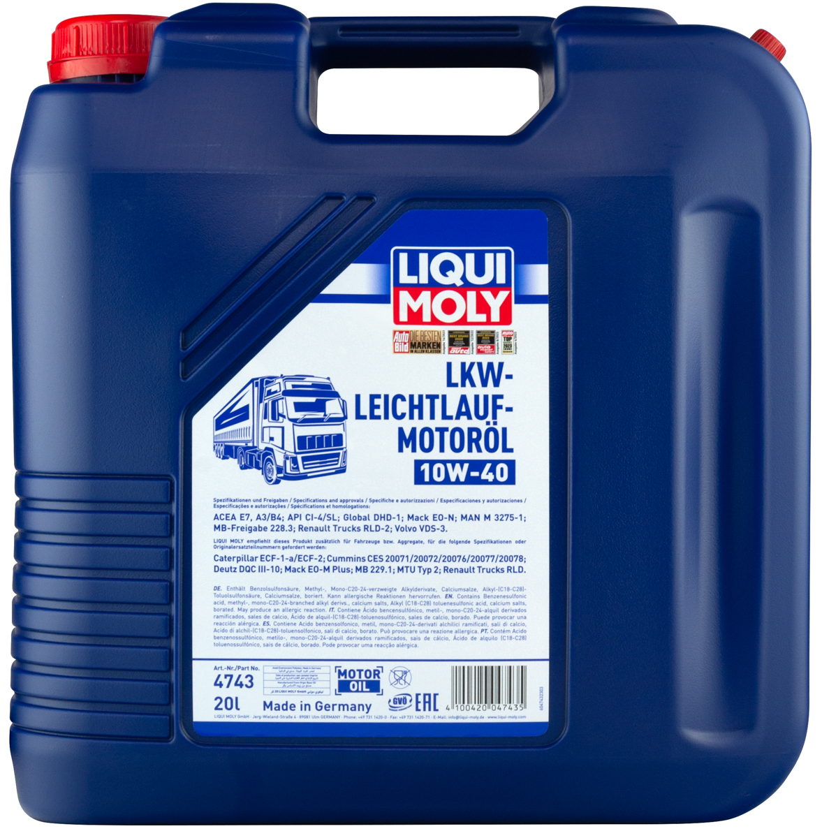 -API: CI-4/SL, -ACEA: E7/A3/B4, -DTFR: 15B110, -Deutz: DQC III-18, -Global: DHD-1, -Mack: EO-N, -Renault: RLD-2, -Volvo: VDS-3